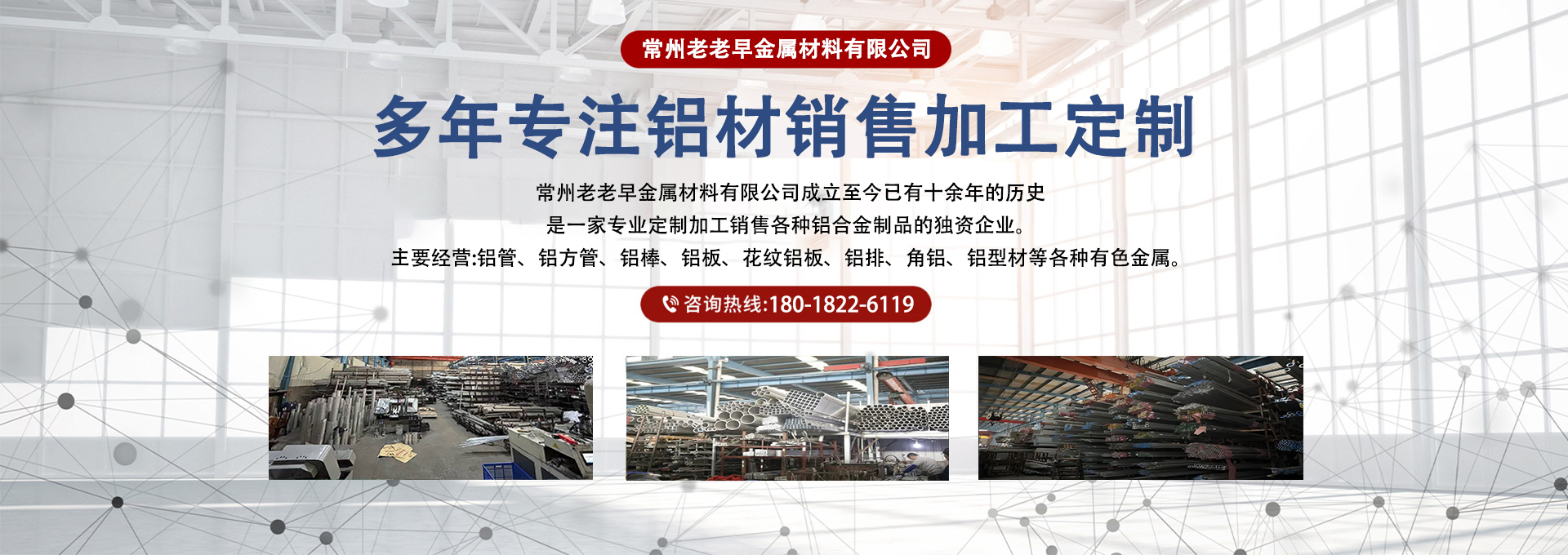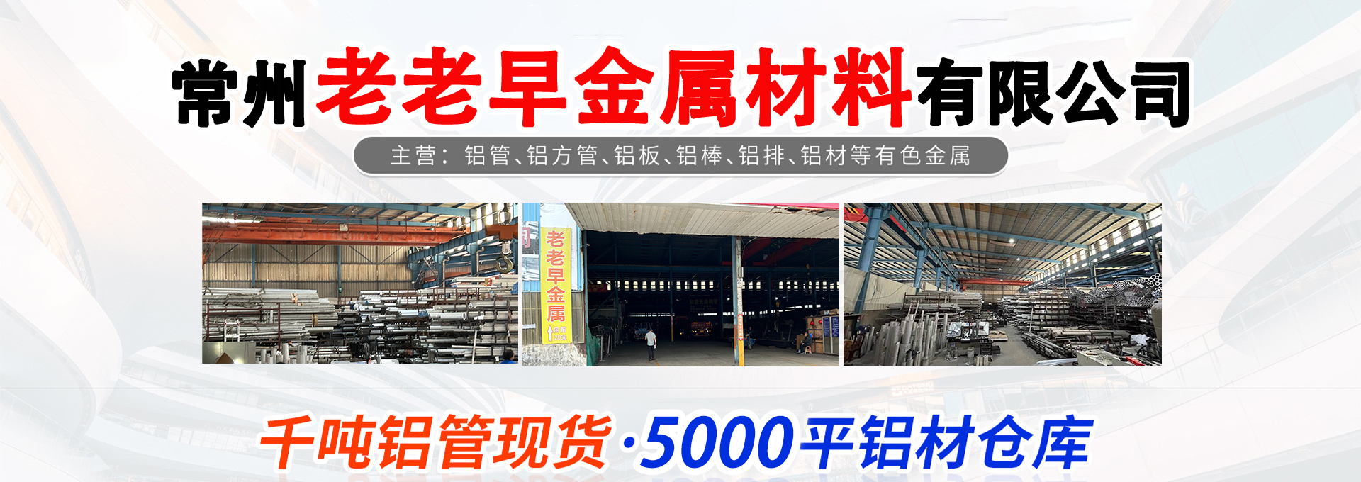 ABOUT US常州老老早金属材料有限公司成立于2015年,位于江南古城智造之都---常州。公司自成立至今已有十余年的历史是一家专业定制加工销售各种铝合金制品的独资企业。本公司主要经营:铝管、铝方管、铝棒、铝板、花纹铝板、铝排、角铝、铝型材等各种有色金属。公司拥有5000平米仓储,千吨现货库存。多年的经营中,公司所售产品均有效管控产品质量。量大价优、现货供应、货期准时,可保证客户做到零库存,以品质优、效率高来满